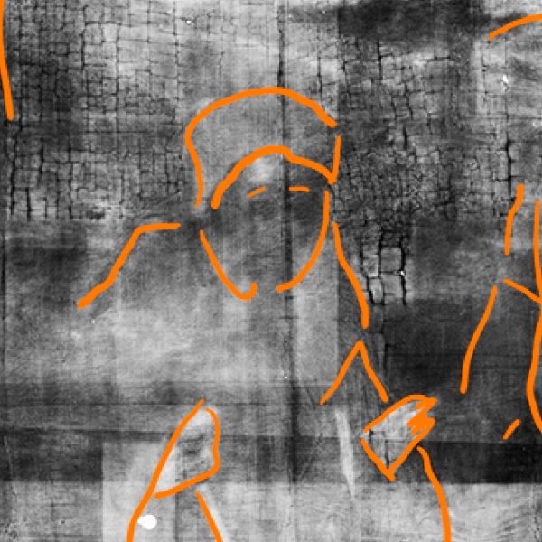 Bowes Museum panel Xray marked close up of figure (possibly shepherd) (photo credit Northumbria University and The Bowes Museum)