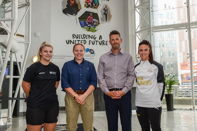 Left to right: Grace Donnelly, Northumbria University Student Sport President, Women's Futsal Captain and Newcastle United Women Goalkeeper, Katy Storie, Head of Sport and Exercise at Northumbria University, Steve Beharall, Acting Head of Newcastle United Foundation and Brooke Cochrane, Captain of Newcastle United Women.