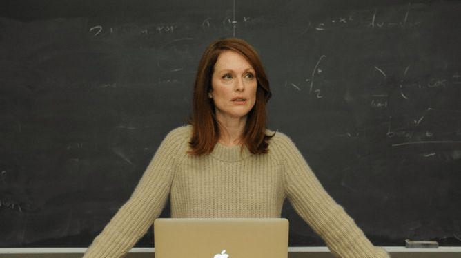 The film is the fictional tale of Alice Howland, an esteemed 50-year-old US linguistics professor, long and happily married to a senior research physician. They have three adult children; a medic, lawyer and a struggling thespian. When giving a lecture, the word “lexicon”, a linguist’s cornerstone, eludes Alice; later a familiar run becomes a nightmarish fog of formless space, shapes and shadows. A rare hereditary type of Alzheimer’s disease is diagnosed and testing reveals a genetic passing on to the elder, pregnant daughter.
